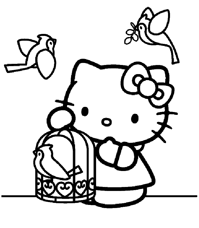 coloriage à imprimer gratuit : Hello kitty et la cage aux oiseaux