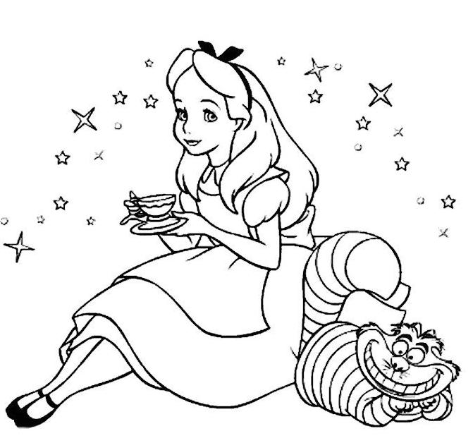 coloriage à imprimer gratuit : alice boit le the avec le chat