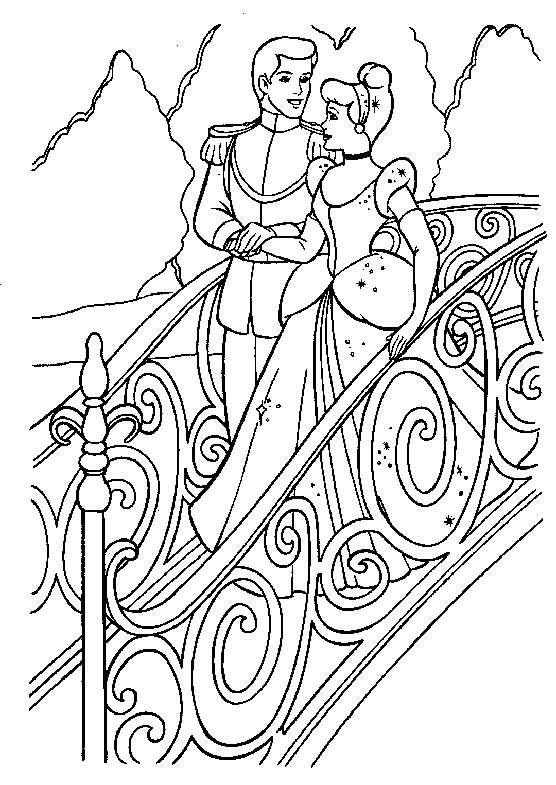 coloriage à imprimer gratuit : cendrillon descend les escaliers avec le prince