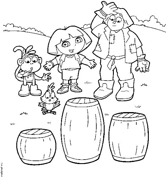 coloriage à imprimer gratuit : dora et ses amis devant des tonneaux