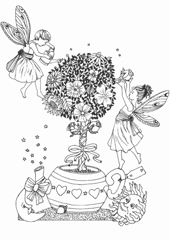 coloriage à imprimer gratuit : fees arrosant les fleurs