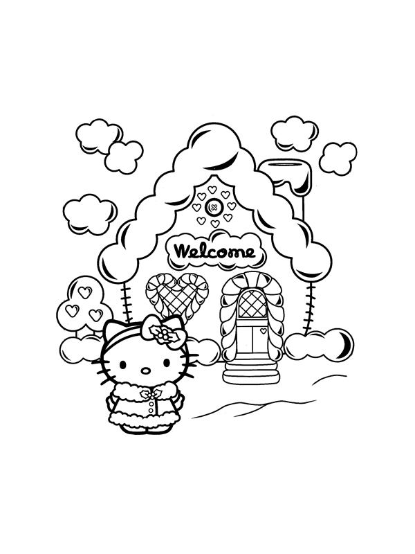 coloriage à imprimer gratuit : hello kitty et la maison de pain d epice