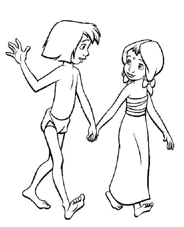 coloriage à imprimer gratuit : le livre de la jungle mowgli et shanti main dans la main