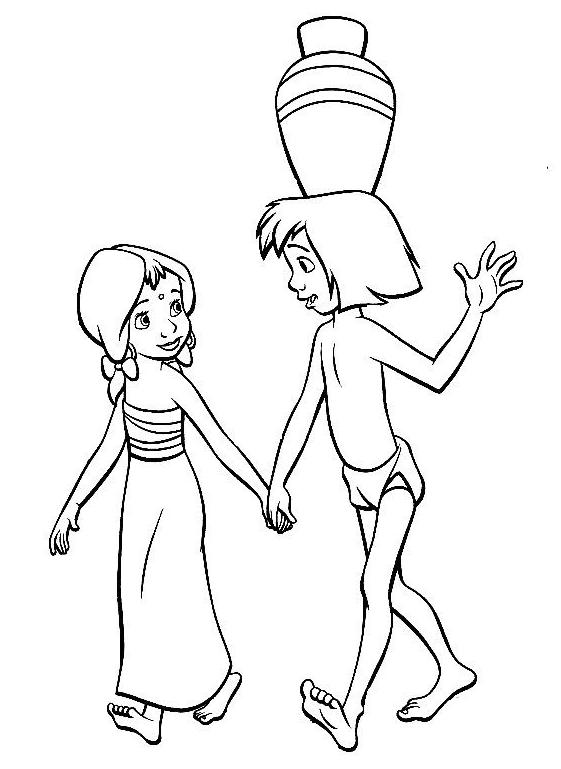 coloriage à imprimer gratuit : le livre de la jungle mowgli et shanti se promenent