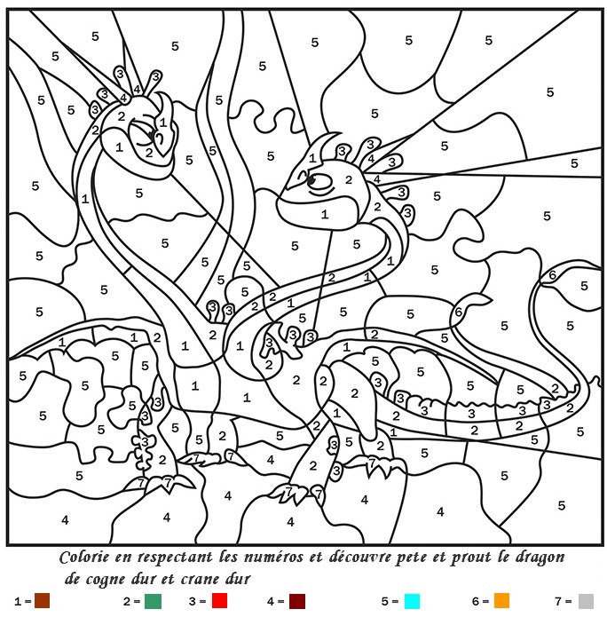colorie en respectant les numéros et découvre pete et prout le dragon à 2 tête de cogne dur et crane dur