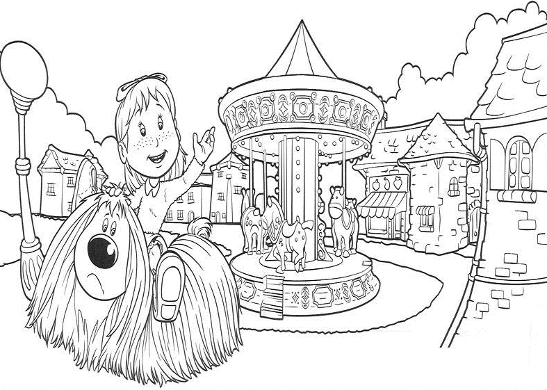 coloriage à imprimer gratuit : pollux porte margotte devant le manege enchante