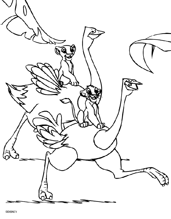 coloriage à imprimer gratuit : simba et nala font la course sur les autruches