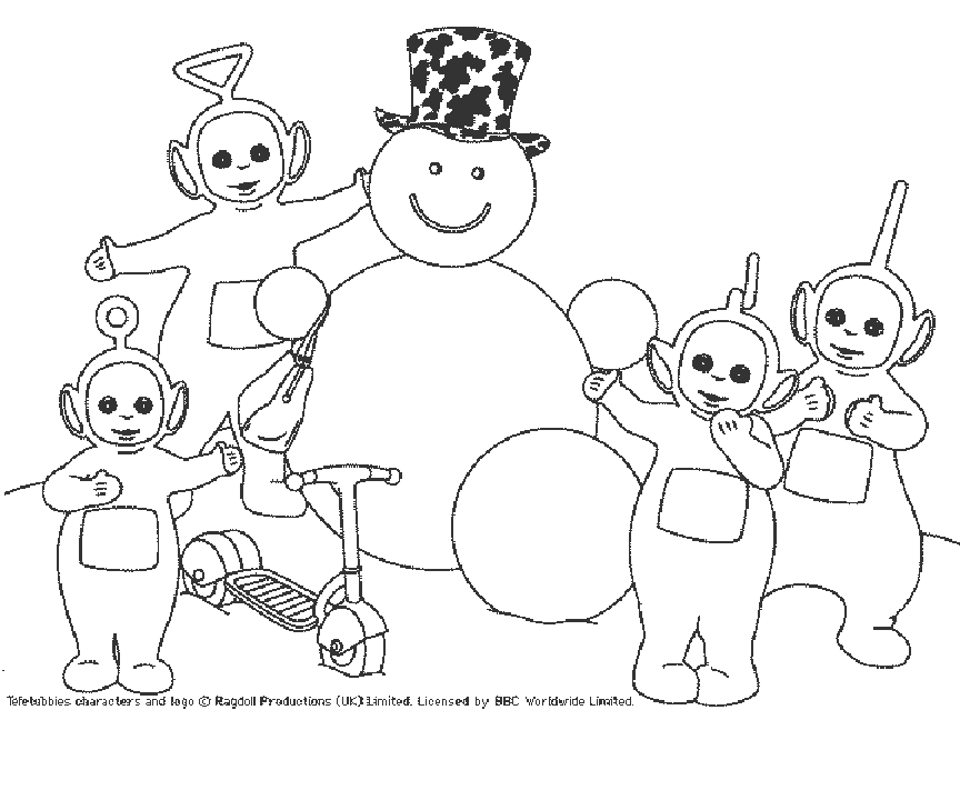 coloriage à imprimer gratuit : teletubbies font un bonhomme de neige