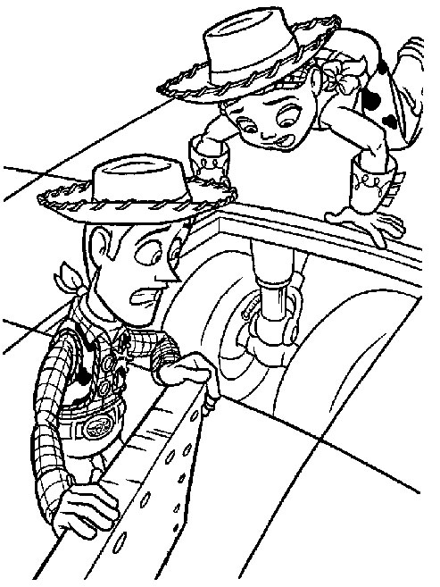 coloriage à imprimer gratuit : toy story woody et jessie ouvrent la trappe