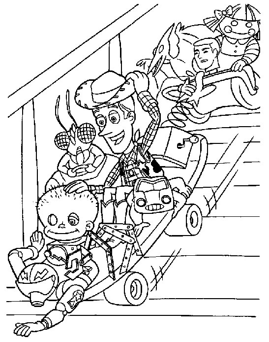coloriage à imprimer gratuit : toy story woody glisse dans les escaliers
